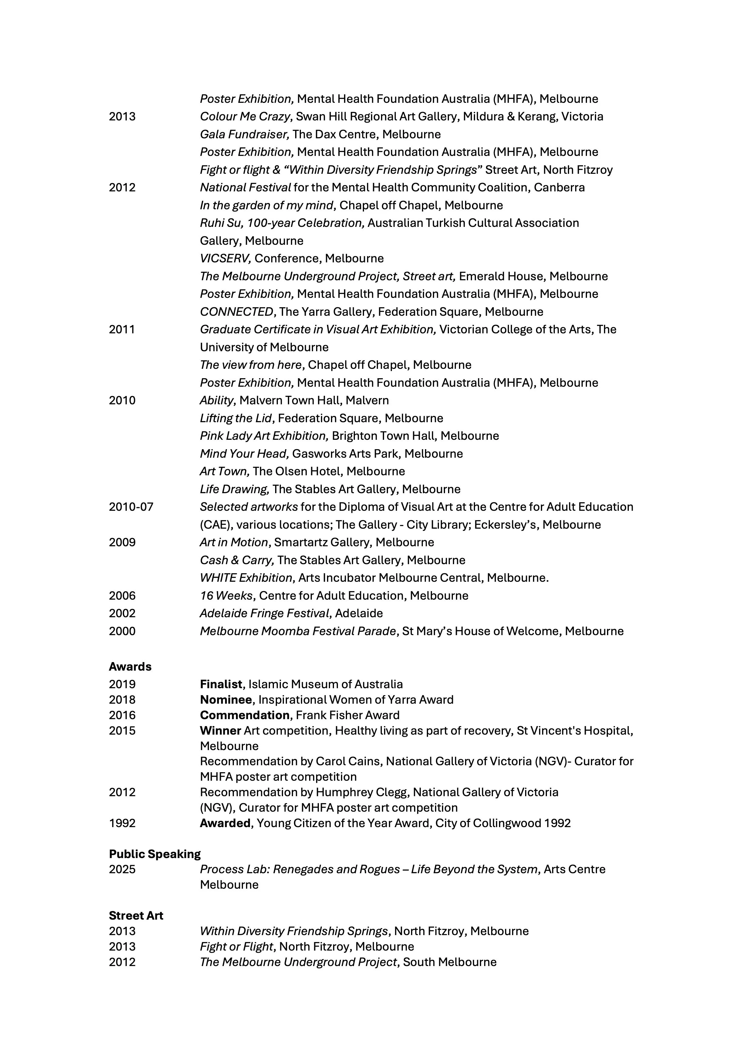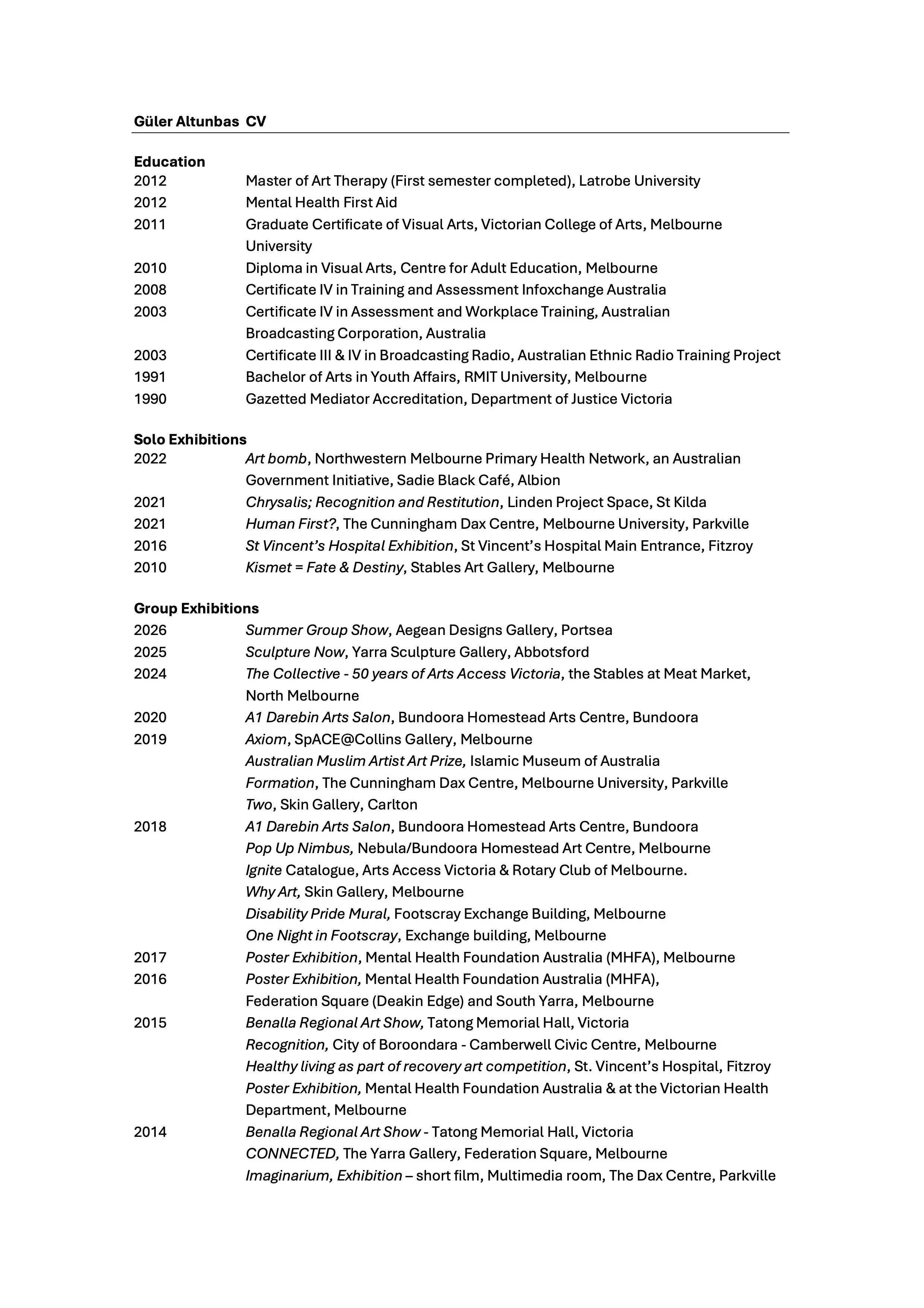She is a mentor, mentee, grant assessor, and recipient of multiple grants through City of Melbourne, and City of Port Phillip, creating impactful projects such as Chrysalis: Restitution & Resolution and The Human First? Project, an online portrait project curating artists with disability at The Dax Centre, University of Melbourne. Güler is one of the founding artists at Nimbus Studios, Arts Access Victoria. Her innovative practice is deeply shaped by lived experience and her long-standing advocacy against violence towards women and children, bringing issues of human rights and social justice to public attention through both creative and civic platforms.
